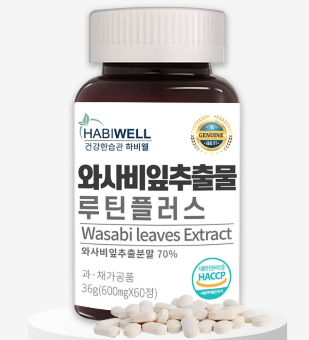 하비웰 와사비잎 추출물은 '하비웰(HABIWELL)'이라는 건강식품 브랜드에서 판매하는 제품으로, 와사비잎 추출물 외 다양한 부원료로 구성되어 있습니다.