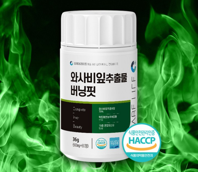 첫 번째로 와사비잎 추출물 버닝핏은 '유케어라이프'라는 브랜드에서 판매하는 제품으로, 아래와 같은 다양한 원료들로 구성되어 있습니다.